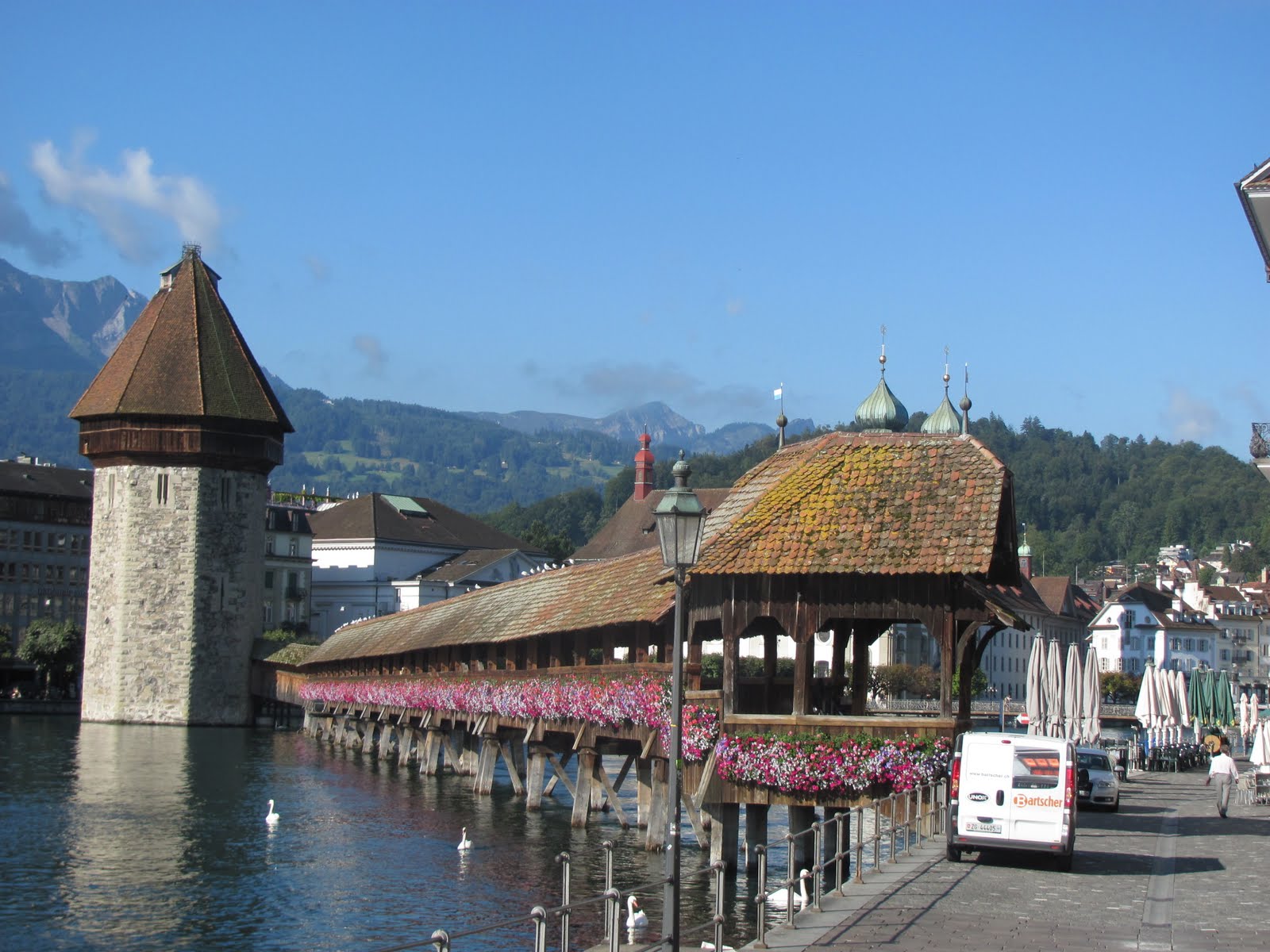 Spent the day catching up on my laundry, shopping, and looking out my window at Lake Lucerne. Everyone has been gone since 7:45 this morning on the extra excursions...no high mountains for me!I repacked my suitcase for the 7th time to get ready for our departure to Paris in the morning at 6:30. That's my last city and then it's HOME! yea! Been gone too long and I'm homesick!Must admit, I had a great time, but I'm ready to get back to family, friends, cat, and my house...no more suitcases! I'm going to post some pictures nof things I saw this morning. One is a picture of a covered wooden bridge with flower boxes on the outside. I walked across it! I took pictures of a lion sculpted in the side of a rock hill, the lake outside my window, and just lots of bldgs and STUFF! Hope you enjoy them! See you in Paris! love, Deb